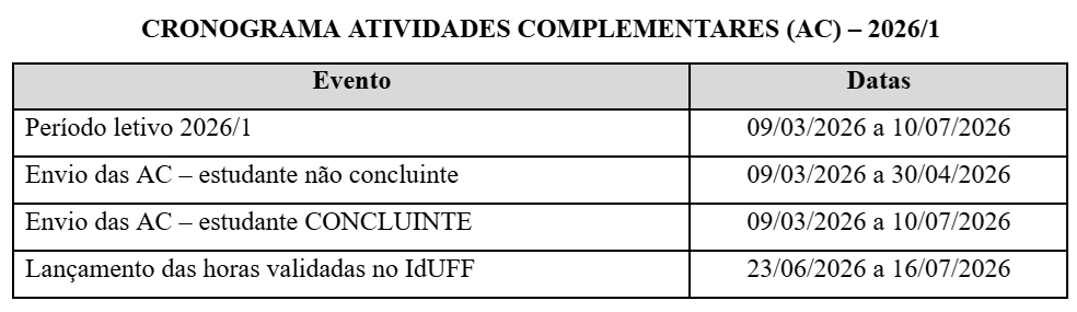As Atividades Complementares (AC) são componentes curriculares obrigatórios de todos os cursos de graduação da UFF, que possuam relação com a área de formação do curso, tais como cursos de extensão, monitorias, iniciação científica e apresentação de trabalhos em eventos científicos, etc; auxiliando na ampliação da formação acadêmica e enriquecendo o processo de ensino-aprendizado.
