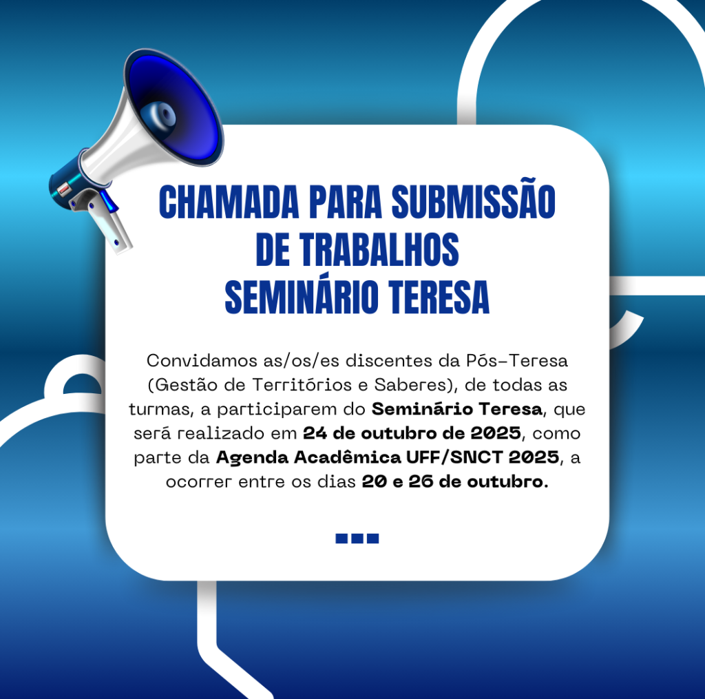 Convidamos as/os/es discentes da Pós-Teresa (Gestão de Territórios e Saberes), de todas as turmas, a participarem do Seminário Teresa, que será realizado em 24 de outubro de 2025, como parte da Agenda Acadêmica UFF/SNCT 2025, a ocorrer entre os dias 20 e 26 de outubro.