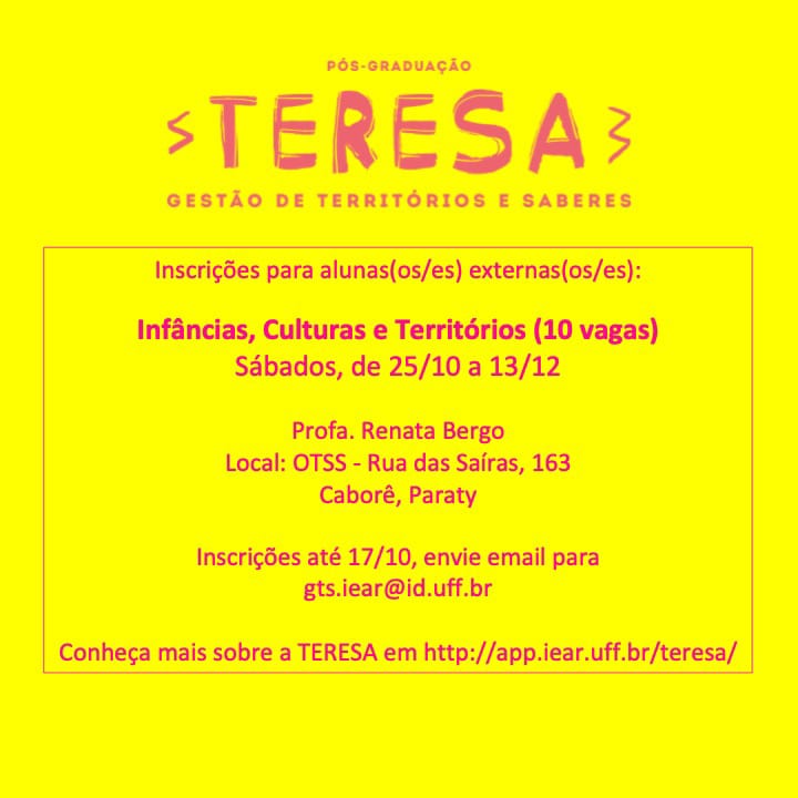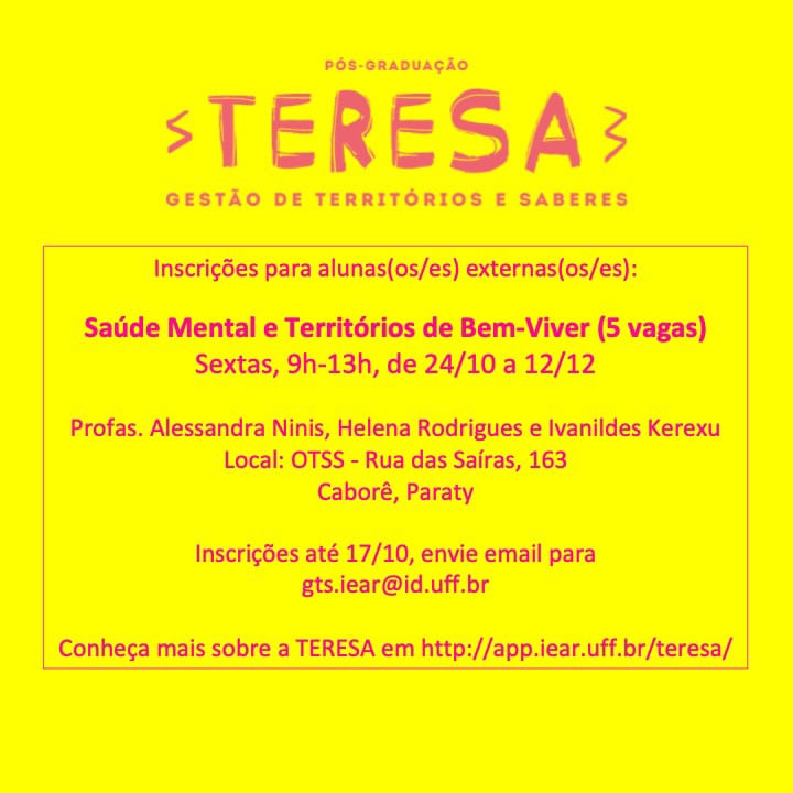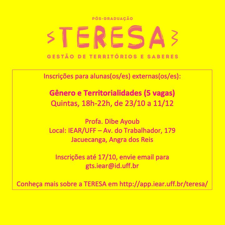 Estão abertas as inscrições para alunas (os/es) externas (os/es) nas disciplinas do 4º bimestre da Pós-graduação em Gestão de Territórios e Saberes (TERESA)!