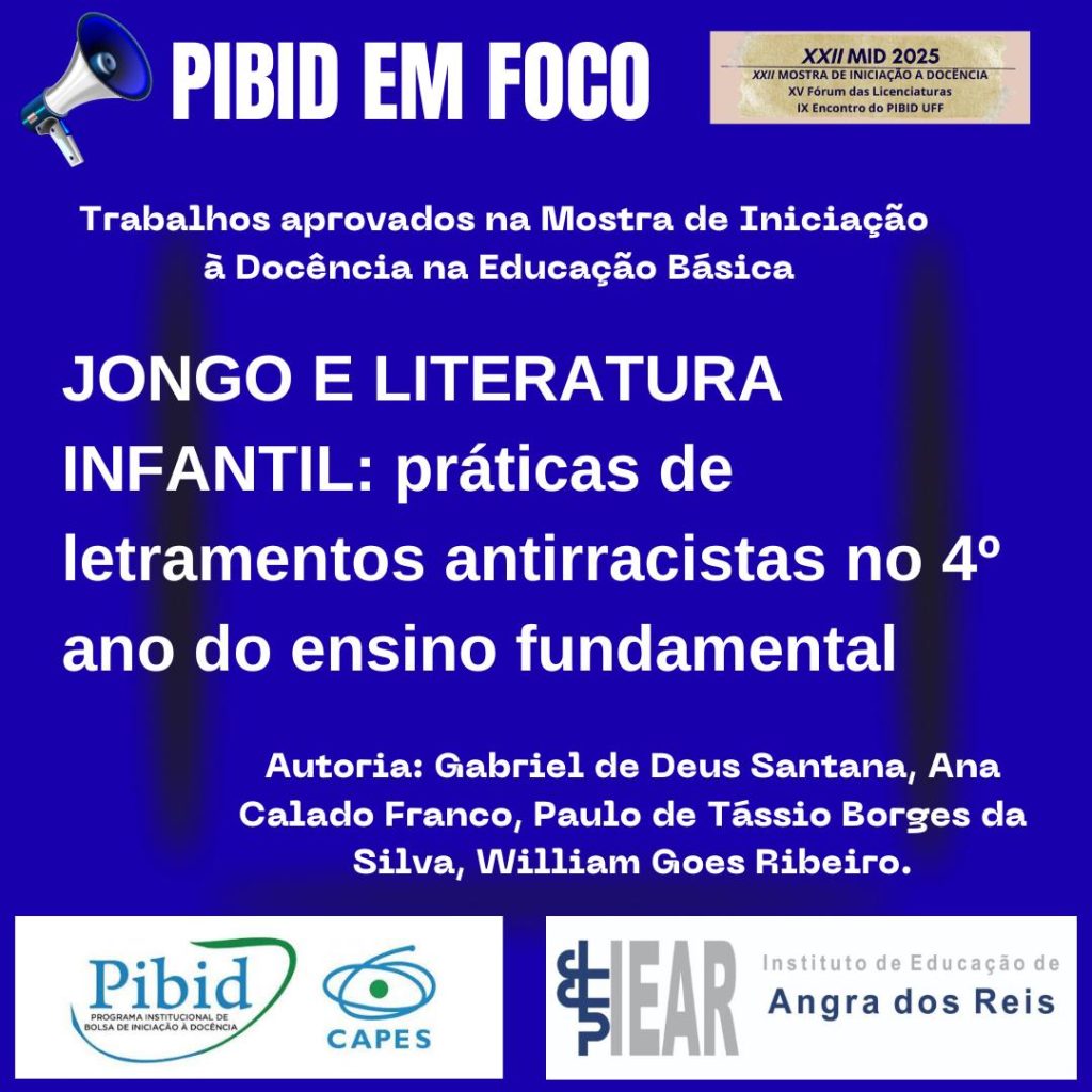 A presente atividade foi desenvolvida no contexto do PIBID – Pedagogia de Angra dos Reis – IEAR/UFF, no projeto “Práticas de letramentos antirracistas”. A experiência de iniciação à docência foi realizada com a turma do 4º ano da Escola Municipal Quilombola Áurea Pires da Gama, rede municipal de Angra dos Reis, e articula-se ao eixo temático Alfabetização, letramentos, infâncias e educação básica. O objetivo consistiu em promover aprendizagens significativas por meio da valorização da cultura afro-brasileira e da literatura infantil, reconhecendo a infância como produtora de saberes. A metodologia envolveu, em um primeiro momento, a realização de uma roda de jongo, na qual as crianças tiveram contato com a história dessa manifestação cultural, aprenderam pontos e participaram do toque no atabaque. Em seguida, foi explorado o livro infantil Ísis e o tambor encantado, que possibilitou a realização de atividades de leitura, interpretação, escrita e desenho. Como resultado, observou-se que os estudantes conseguiram estabelecer relações entre a narrativa literária e a experiência vivida na roda de jongo, ampliando seu repertório cultural e fortalecendo processos de leitura e escrita. Conclui-se que a articulação entre práticas culturais e literárias pode contribuir para a formação leitora, a valorização da diversidade e o desenvolvimento de letramentos críticos na educação básica.