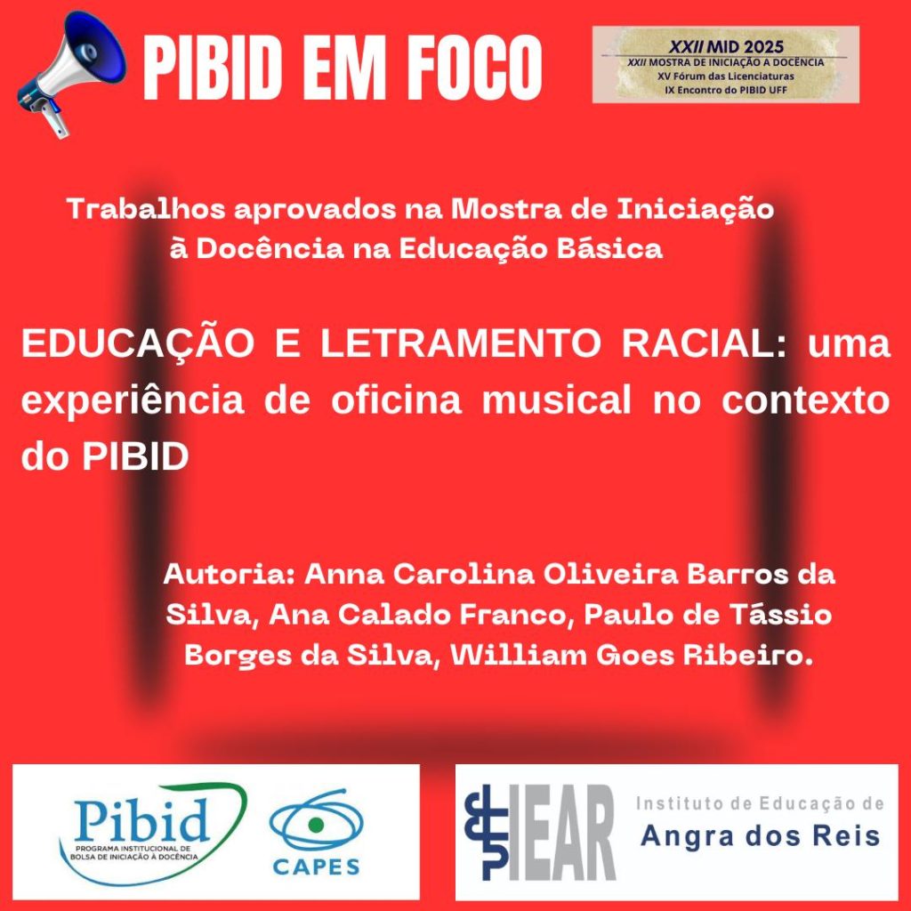 A presente atividade foi desenvolvida no contexto do PIBID – Pedagogia de Angra dos Reis – IEAR-UFF, no projeto “Práticas de letramentos antirracistas”. A experiência de iniciação à docência aqui compartilhada se deu nas turmas do 4º e 5º anos da E.M. Quilombola Áurea Pires da Gama, rede municipal de Angra dos Reis. O tema central do trabalho é a educação voltada à interculturalidade, diversidade e inclusão, com enfoque no letramento racial. O objetivo da ação consistiu em fomentar reflexões críticas sobre o racismo, ampliando o letramento dos estudantes a partir de práticas pedagógicas que dialogassem com a realidade social e cultural vivenciada por eles. A metodologia utilizada foi a realização de uma oficina de música com base na canção “Vidas Negras Importam”, de Martinho da Vila. Após a audição, os alunos foram convidados a selecionar palavras ou expressões significativas, registrando-as em folhas A4, cada uma em cor distinta. Essa dinâmica favoreceu a expressão individual e coletiva, possibilitando a construção de sentidos múltiplos sobre a temática. Os resultados evidenciaram que os estudantes possuem conhecimento prévio sobre o racismo, sendo capazes de citar exemplos vivenciados tanto em sala de aula quanto em seus contextos familiares. A atividade revelou, portanto, o potencial do trabalho intercultural sensível para a promoção de espaços educativos inclusivos e de fortalecimento da identidade dos alunos na luta contra práticas racistas.