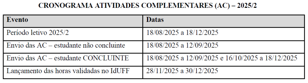 Dúvidas podem ser encaminhadas para a Coordenadora de Atividades Complementares Adriana M. Sanseverino (adrianams@id.uff.br).