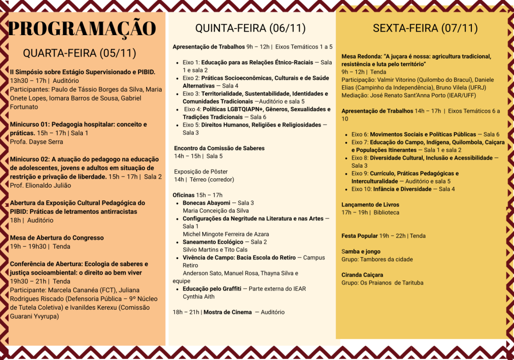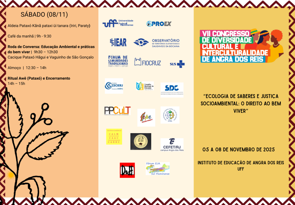 O VII Congresso, que tem como tema central “Ecologia de saberes e justiça socioambiental: o direito ao bem viver”, será realizado nos dias 5, 6, 7 e 8 de novembro de 2025, no Instituto de Educação de Angra dos Reis da Universidade Federal Fluminense, com debates, mesas redondas, rodas de conversa, mostra de cinema, oficinas, lançamento de livros e festa popular. Os participantes inscritos (ver link www.proex.uff.br/evento/?ev=11798) podem assistir ao evento, bem como inscrever trabalhos para apresentação e debate, de forma gratuita.